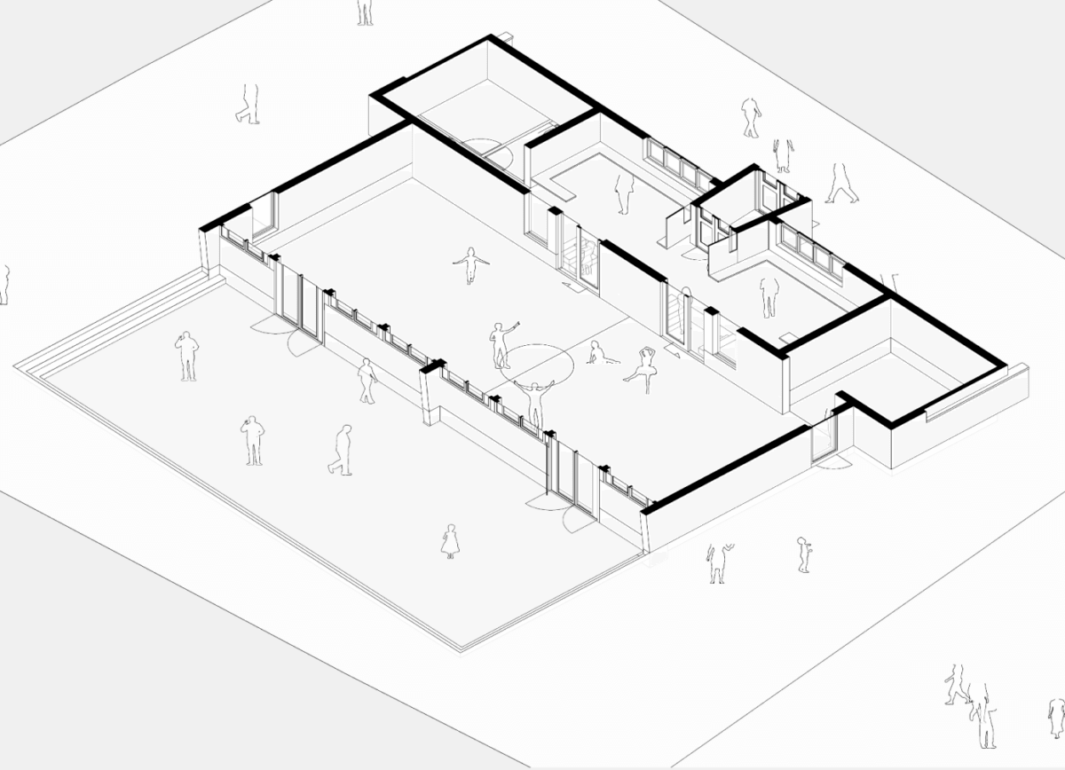 We verdiepen de vloer van het bijgebouw een halve meter en verwijderen de wand tussen de lokalen. Hierdoor ontstaat een fijne gymzaal. Aan de voorzijde komt een verlaagd speelveld. Zo kan er binnen en buiten gesport worden. Samen met de gymdocent kijken we naar de inrichting en spelvoorzieningen.